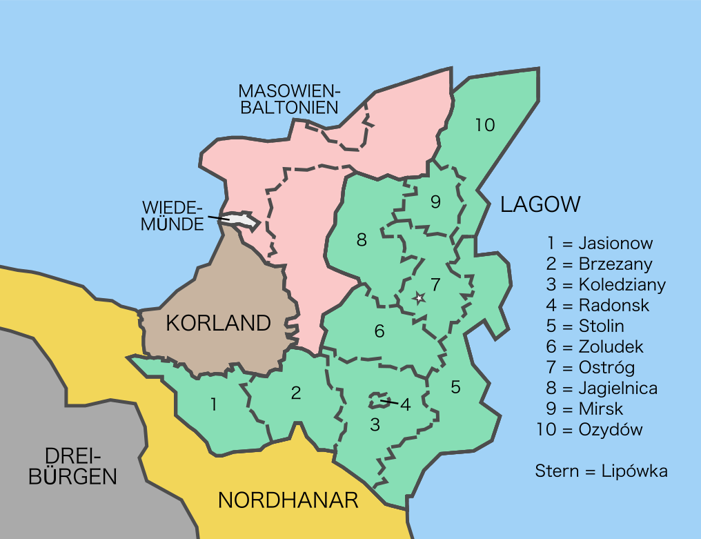 Die Karte, deren Urheber Clausi ist, zeigt CartA-technisch (Dreibürgern und Nordharnar gehören natürlich nicht dazu) das Innere von Lagow (Lagow selbst, Korland, Wiedemünde (allerdings etwas zu groß, da technisch Alsztyna) und Masowien-Baltonien.