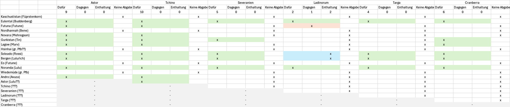 Ich weiß ich mach hier nicht als Delegierter mit und ich hab hier auch nicht die Regeln geschrieben, aber ich check es nicht, wie man eine internationale "Nationen"-Konferenz aufzieht und dann muss man diesen durch und durch politischen Aufnahmeprozess durchgehen. Ich seh' da keinerlei Simpotenzial ausser, dass Unliebsame ausgeschlossen werden. Ich kann mir noch vorstellen, dass Futuna bspw. ein simulatorisches Problem mit Ladinien hat, da eben im äquatorialen Bereich machtpolitisch agierend, aber gefühlt müsste doch Bergen mit der Noraundie dann ein viel größeres Problem haben, da es da um das Teile des gleichen Landes geht, oder?